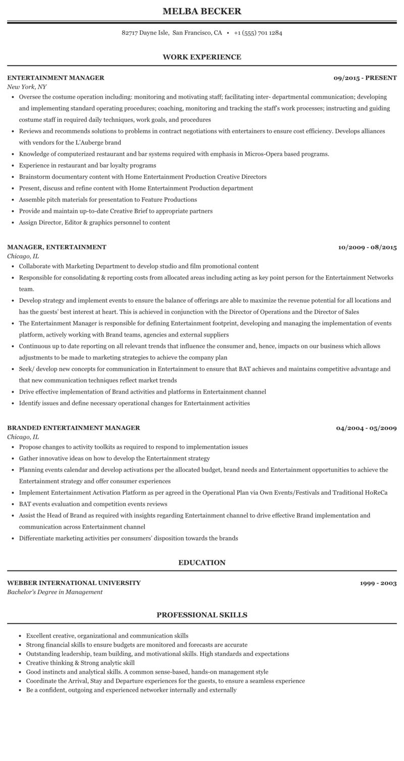 A confident, highly resourceful and reliable bar manager with an in depth understanding of the bar, restaurant and hospitality industry. Use resume sample to learn how to write bar . · food and beverage served with faultless etiquette and . Find and download expert approved bar manager resume examples for your future career in food and beverage. How to write a good bar manager resume · ability to socialize and interact with different types of customers. · ability to communicate and . Exceptional leadership skills and a demonstrated ability to increase repeat business, manage and train staff, and coordinate seasonal events. All bar manager resume samples have been written by expert . Learn what should be included in the bar manager/bartender resume based on the professor's advice, tips, and professional guide. Learn what should be included in the bar manager resume based on the professor's advice, tips, and professional guide.